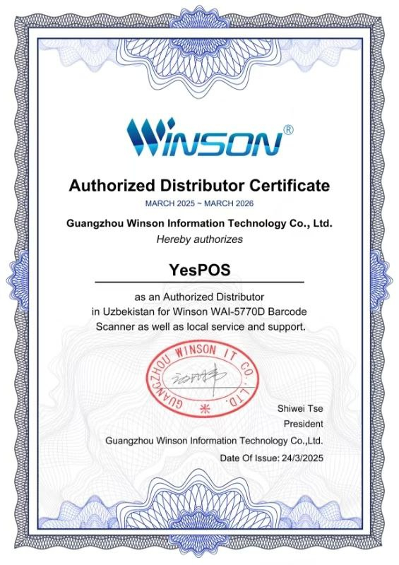 YesPOS kompaniyasi Winson WAI 5770D modelining yagona disterbutori haqida sertifikat guvohnoma (litsenziya) ko'chirmasi: